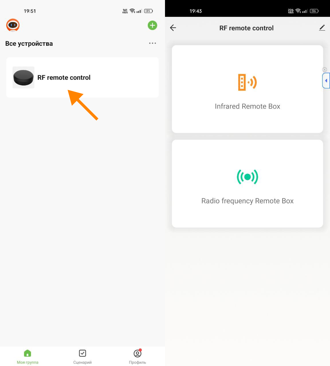- Нажмите на добавленный пульт - откроется окно выбора типа добавляемого устройства IR либо RF 433